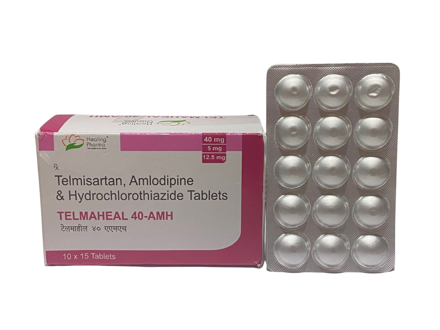 Telmisartan 40mg, Amlodipine 5mg & Hydrochlorothiazide 12.5mg | Brand – Telmaheal AMH | Manufacturer – Healing Pharma | Pack of 15 Tablets